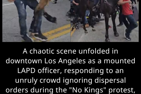 A chaotic scene unfolded in downtown Los Angeles as a mounted LAPD officer, responding to an unruly crowd ignoring dispersal orders during the “No Kings” protest, advanced on a demonstrator who refused to move
